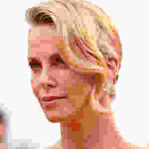 Charlize Theron's muted golden blonde hue gleams against her porcelain skin.